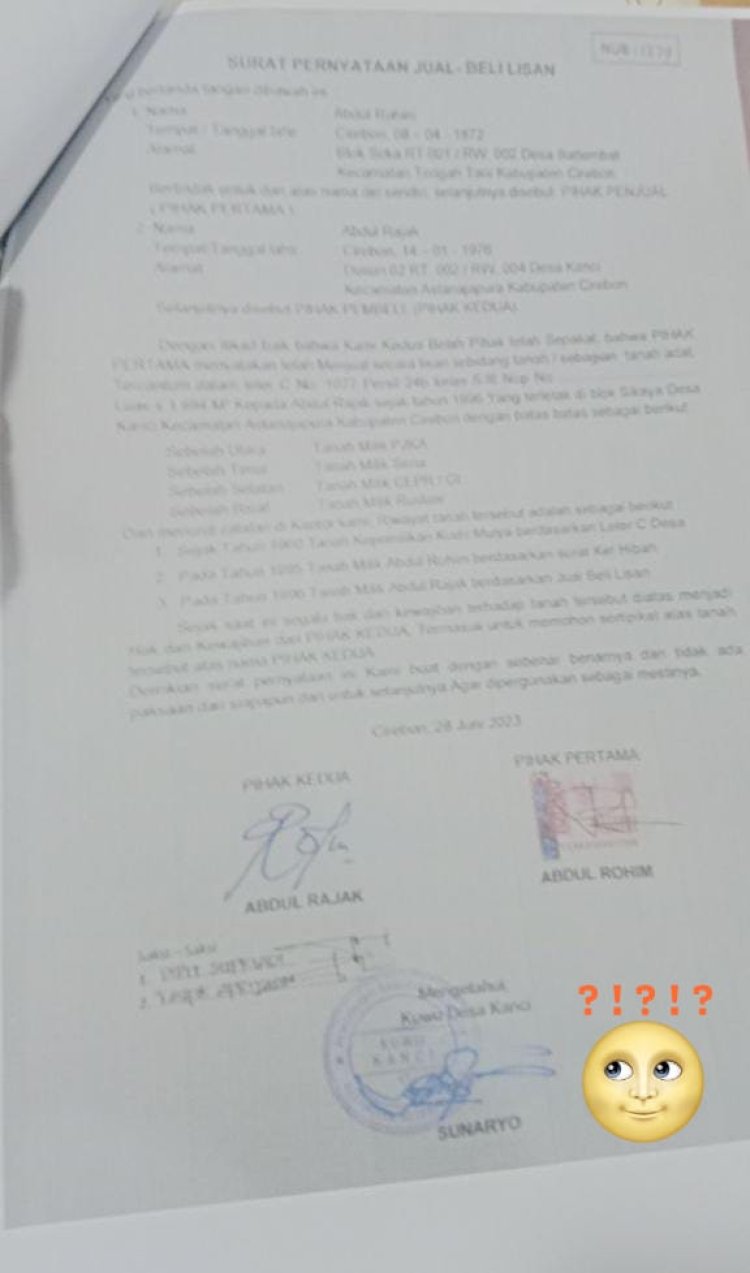 SOROT REPUBLIKA| CIREBON – Sampai saat ini Sunaryo kepala desa Kanci belum memberikan klarifikasi terkait tanda tangan dan stempel ganda diatas perjanjian jual beli antara Abdul Rajak dan Abdul Rohim pada tahun 2023 pasalnya dengan dasar itu yang akhirnya terbit sertifikat an. Abdul Rajak namun anehnya sampai saat ini tanah tersebut masi dikuasai oleh orang lain yang juga merasa punya hak atas tanah tersebut.
