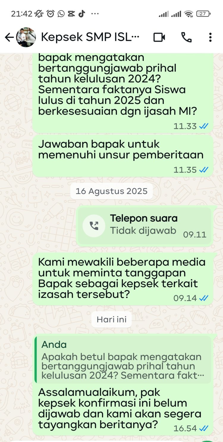 Kepala Sekolah SMP Islam Al Ifadah Cilamaya Wetan Tidak Menjawab Konfirmasi Wartawan Atas Berita Tuduhan Manifulasi Ijazah?