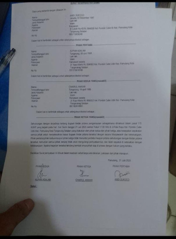 Pada saat itu RJ berjanji akan bertemu pada siang hari sekitar pukul 14.00 wib.setelah di tunggu ternyata RJ mengutus orang yang tidak ada kaitannya dengan peristiwa itu, atas dasar itu maka kami berinisiatif untuk melaporkan ke Polres Tangerang Selatan (Tangsel).
