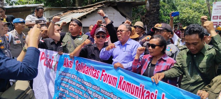 Sorotrepublika.com | Indramayu - Buntut dugaan penghinaan yang dilakukan oleh calon Bupati (Cabup) Indramayu nomor urut 2, Lucky Hakim, terhadap profesi jurnalis, ratusan massa yang tergabung dalam Forum Komunikasi Jurnalis Indramayu (FKJI) menggelar aksi unjuk rasa di depan kantor KPU Indramayu, Jawa Barat, Selasa (19/11/2024).
