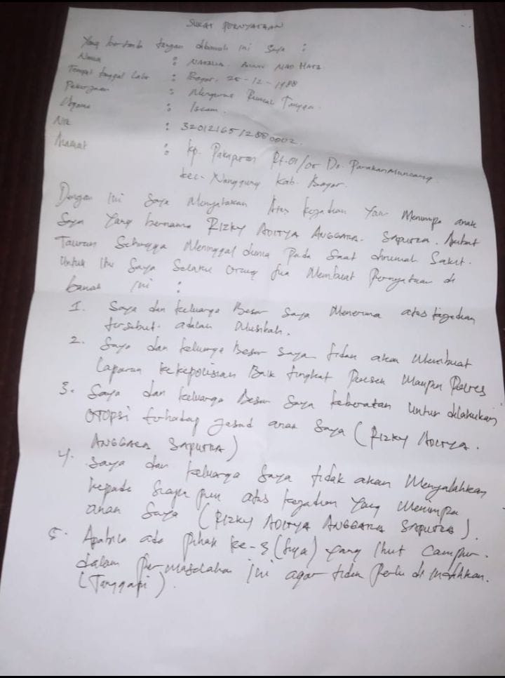 Pasalnya dugaan intimidasi yang dilakukan oleh oknum anggota Polsek Cibungbulang polres Bogor ini kerap menyalakan kode etik sesuai SOP adanya pemberian surat pernyataan perdamaian secara sepihak yang dilakukan oleh Polsek Cibungbulang polres Bogor kepada keluarga korban yang dalam keadaan tertekan dan sedang berduka.