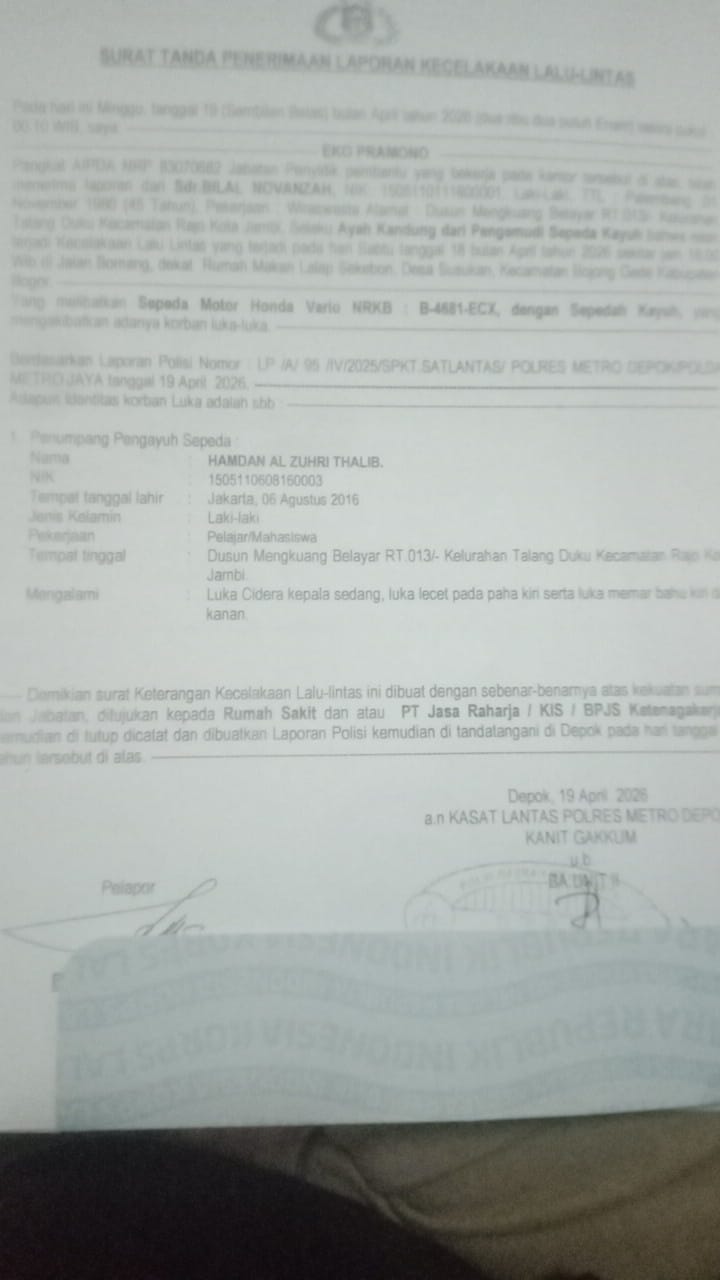 Perkara ini diketahui telah masuk dalam laporan resmi kepolisian dengan nomor: LP/A/95/IV/2026/SPKT Satlantas Polres Metro Depok/Polda Metro Jaya.