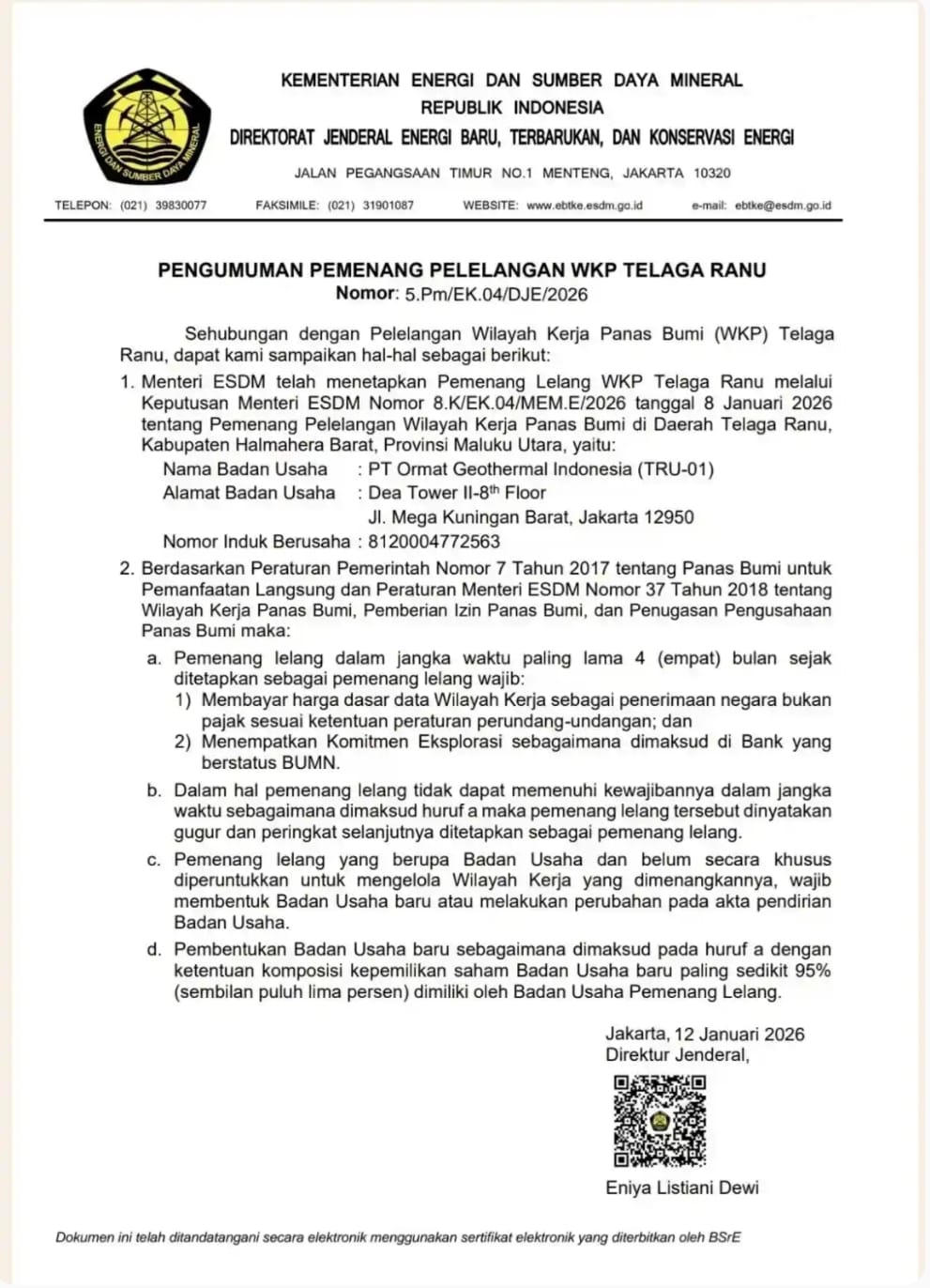 Pengamat hukum asal Maluku Utara, Muslim Arbi, menilai diamnya gubernur bukan sikap netral, melainkan keputusan yang berdampak langsung pada kemenangan PT Ormat Geothermal Indonesia dalam lelang Wilayah Kerja Panas Bumi (WKP) Telaga Ranu.