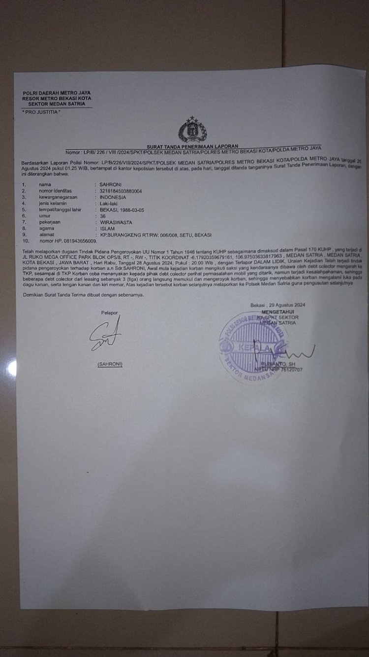 Dengan adanya Kejadian ini pihak debitur dan saudara Sahroni didampingi pengacaranya langsung melaporkan kejadian ini ke Polsek Medan Satria Bekasi Kota.