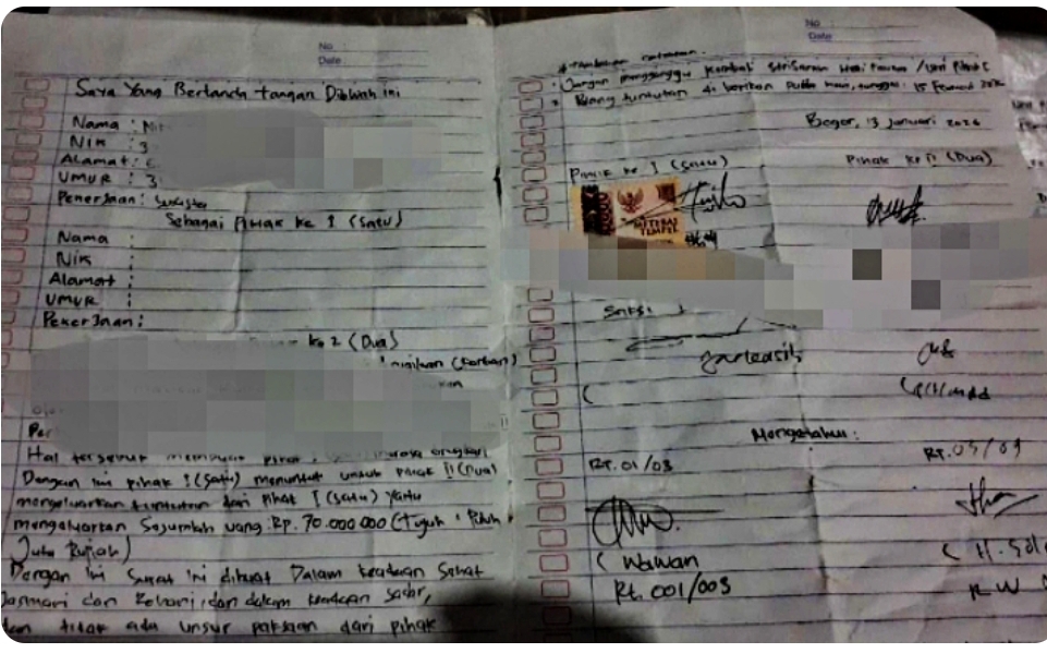 Selain itu, berdasarkan informasi dari DK, katanya terdapat kejanggalan dalam pembuatan surat perjanjian ganti rugi.