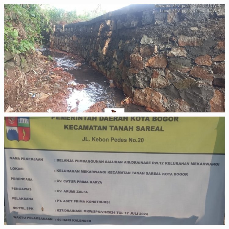 Proyek Belanja Pembangunan Saluran Air/Drainase RW 12 Kel. Mekarwangi, yang menggunakan APBD Kota Bogor Tahun Anggaran 2024, pagu anggaran sebesar Rp. 148.319.723,35, dengan Pelaksana PT. Aset Prima Kontruksi, sebagai konsultan pengawas adalah CV. Arumi Zalfa, No./Tgl SPK : 027/Drainase MKW/SPK/VII/2024 Tgl. 17 Juli 2024, waktu Pelaksanaan 60 Hari Kalender