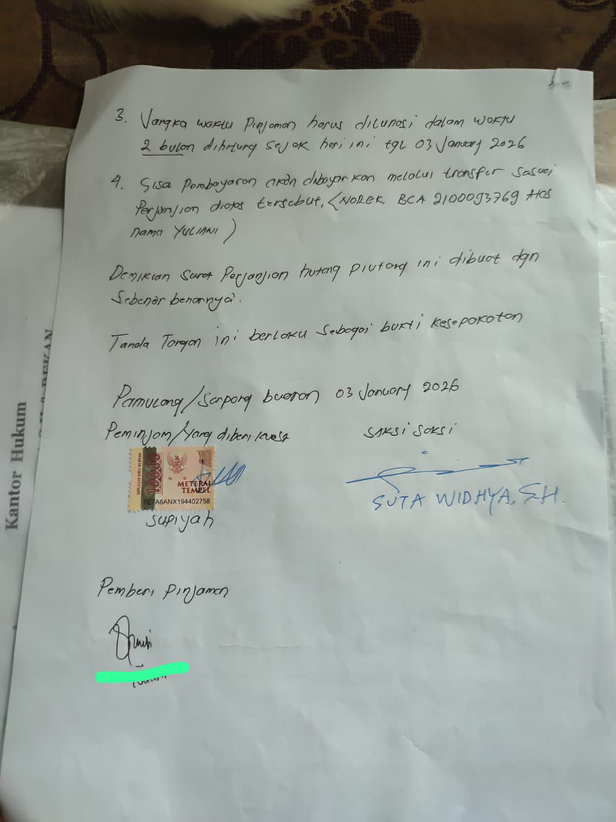 Pada Sabtu 3 Januari 2026 ibu Supiyah kembali membayar sebesar Rp. 18.000.000 sebagai pembayaran akhir dari utang pokok dua puluh lima juta rupiah.