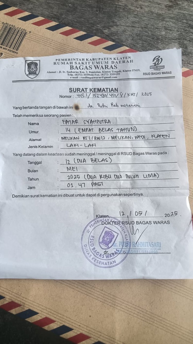 Tak kuat menahan sakit korban sempat dilarikan ke Rumah Sakit RSUD Bagas Waras Klaten, dan dinyatakan meninggal dunia. Hingga berita ini ditayangkan.