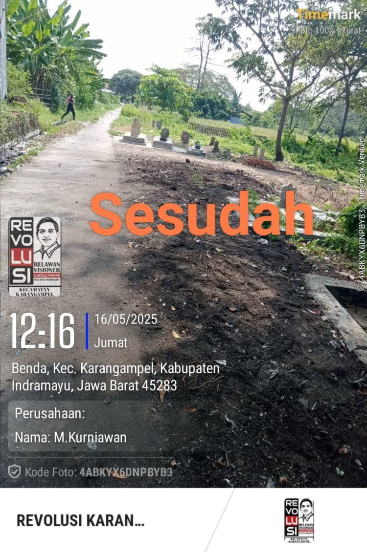 Subagyo wibisono ketua team Revolusi karangampel mengucapkan kepada teamnya, "Terimakasih yang sebesar-besarnya untuk jajaran PK dan PD yang terlibat kerjabakti di area kuburan (TPU) desa Benda, semoga amal yang kalian tanam akan menuai nanti di akhirat kelak. Semoga dengan niat kita ibadah Allah akan memberi kenikmatan yg lebih.. aamiin.. aamiin ya rabbal Alamiin, Pungkasnya"